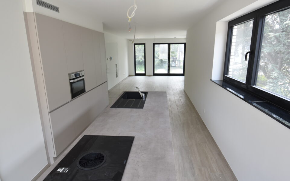 . Ingerichte open keuken voorzien van alle toestellen: spoelbak, ijskast, diepvries, bora-kookplaat, vaatwasmachine, combi-oven, inbouwkast voor wasmachine en droogkast.