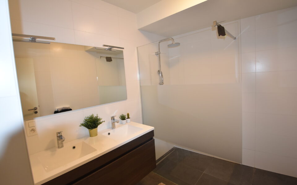 . Ingerichte badkamer met inloopdouche en badkamermeubel