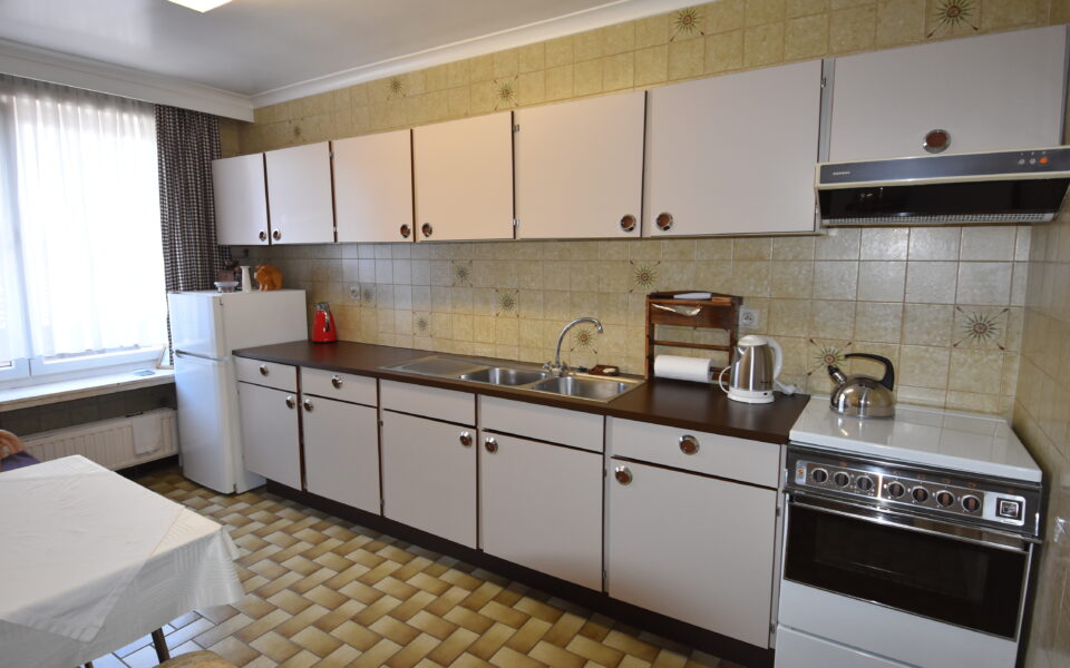 . Ingerichte keuken: dubbele spoelbak, gasfornuis, dampkap.