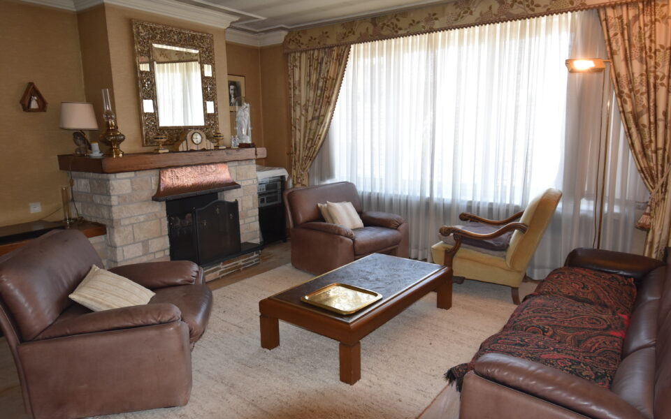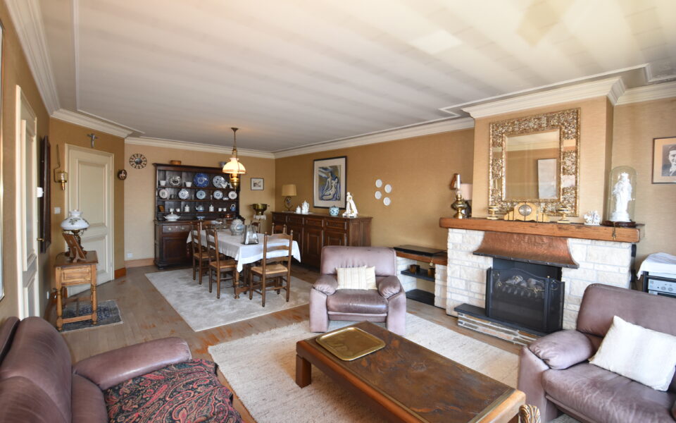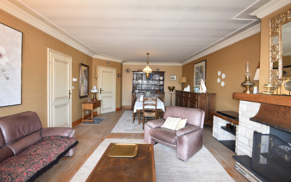. Lichtrijke leefruimte met open haard en mooie parketvloer.