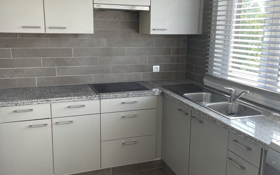 – ingerichte keuken met keramische kookplaat, dampkap, dubbel spoelbak en vaatwasser