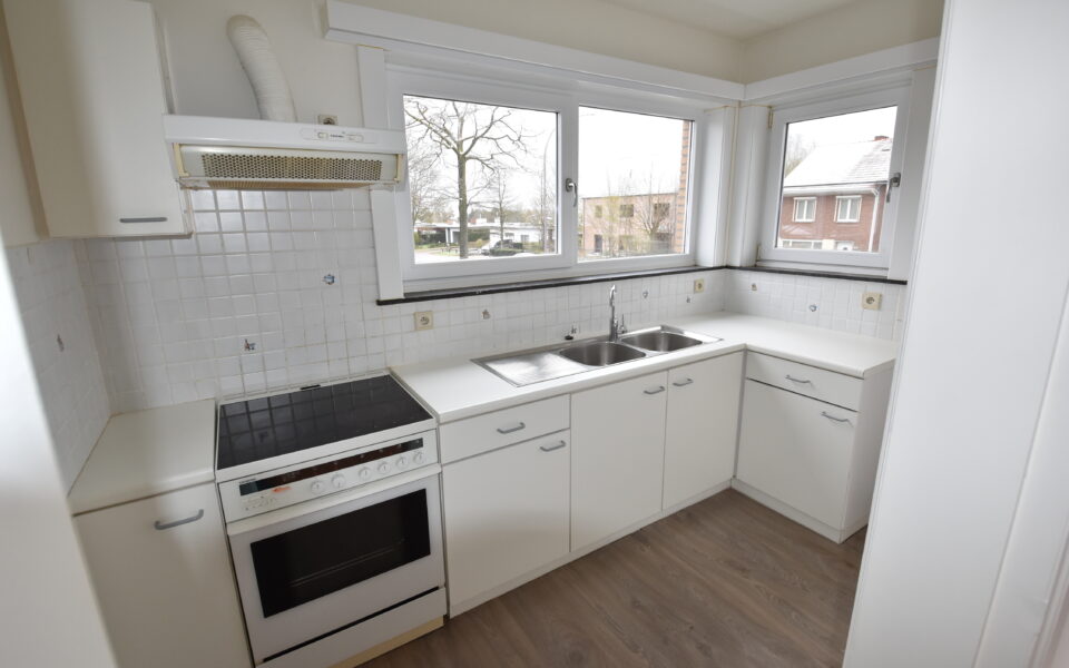 Aparte ingerichte keuken met elektrische kookplaat, dampkap, dubbele spoelbak en kasten,
