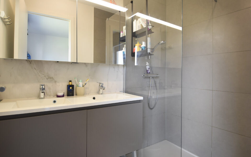 De mooie badkamer Is voorzien van een ruime inloopdouche en een dubbel lavabomeubel met spiegelkast.