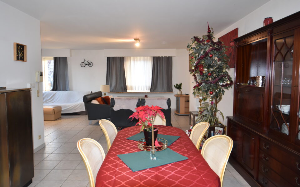 Inkomhal/gang, zeer ruime lichtrijke leefruimte, keuken, apart toilet, badkamer: ligbad, lavabo, toilet, 2 slaapkamers, berging/wasplaats, stookplaats, terras (6m²)