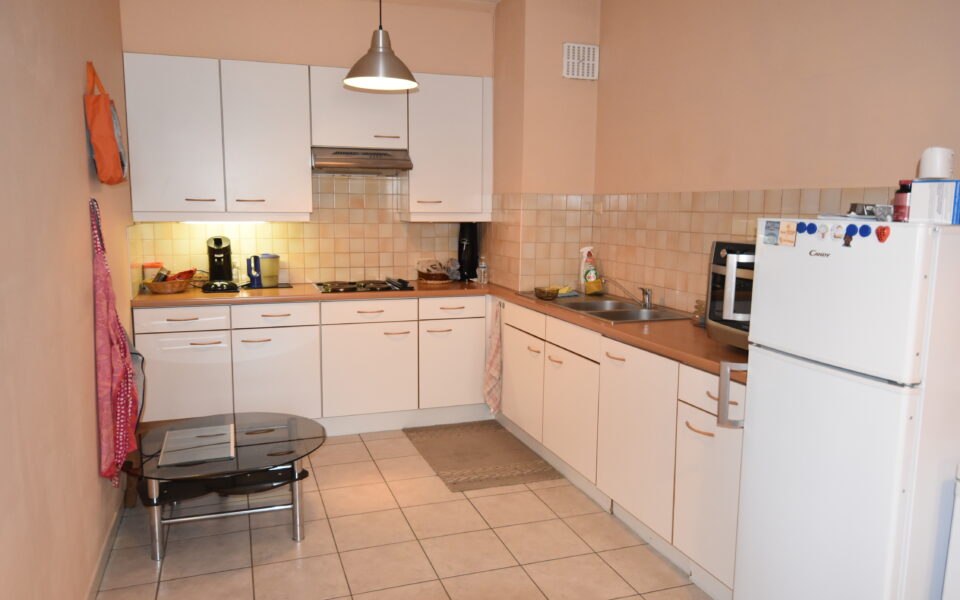 Inkomhal/gang, leefruimte met open keuken, berging, badkamer: ligbad en lavabo, apart toilet, 1 slaapkamer, was en stookplaats, terras (6m²)