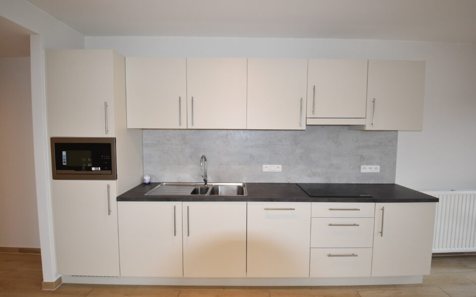 . Lichtrijke leefruimte met een ingerichte open keuken : inductie-kookplaat, dampkap, ijskast + diepvriesvak, vaatwasmachine, microgolf