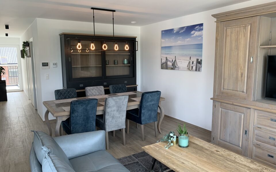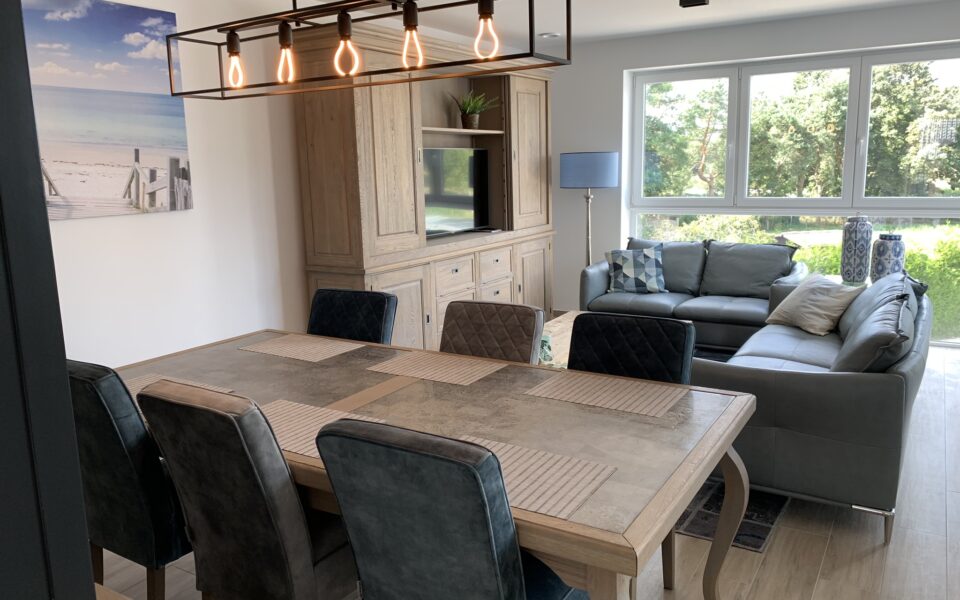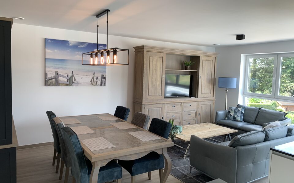 . Lichtrijke, gezellige leefruimte met open keuken voorzien van alle toestellen.
