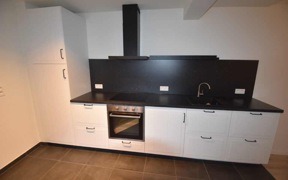. Open nieuwe keuken met oven, kookplaat en dampkap, ijskast en spoelbak.