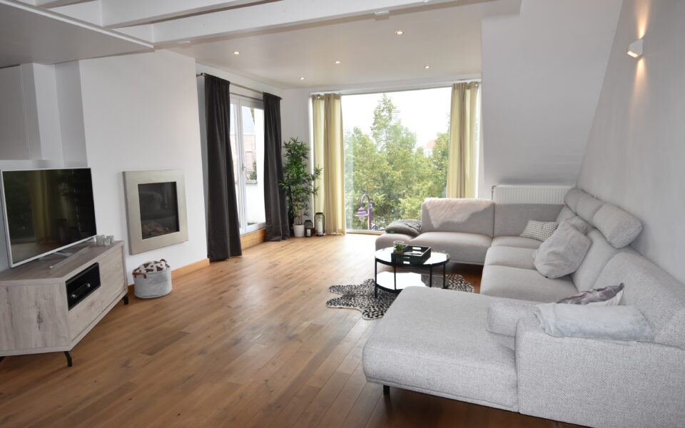 . Zeer ruime lichtrijke leefruimte met haardcassette, parket