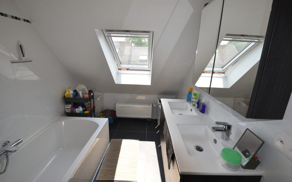 – Ingerichte badkamer: ligbad met douchemogelijkheid, dubbele lavabomeubel