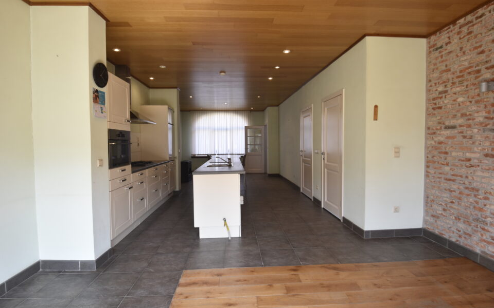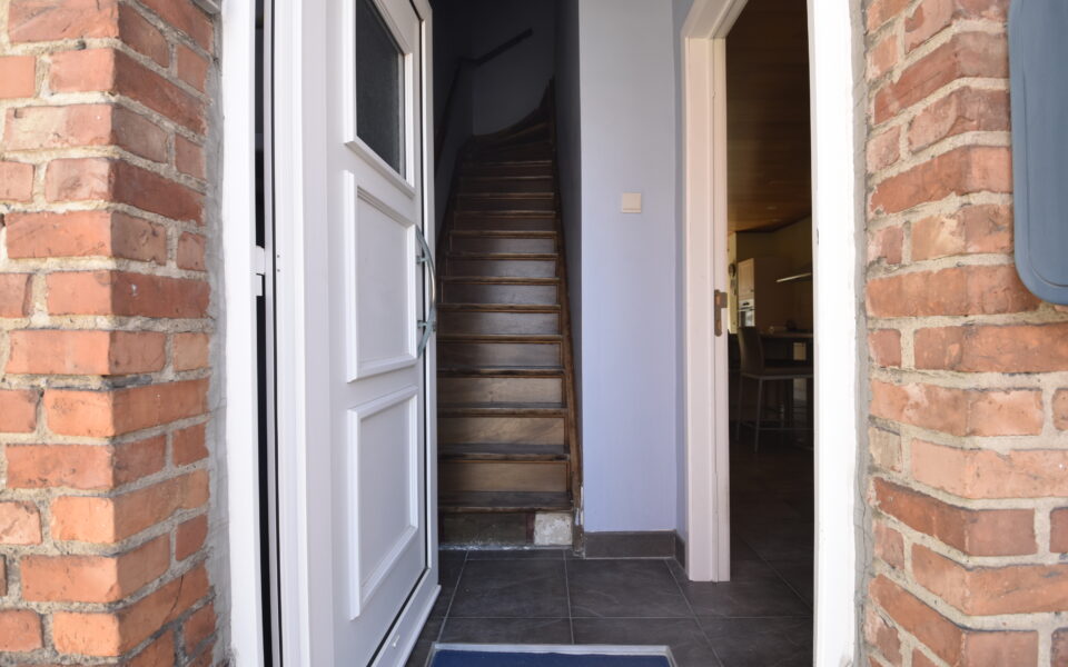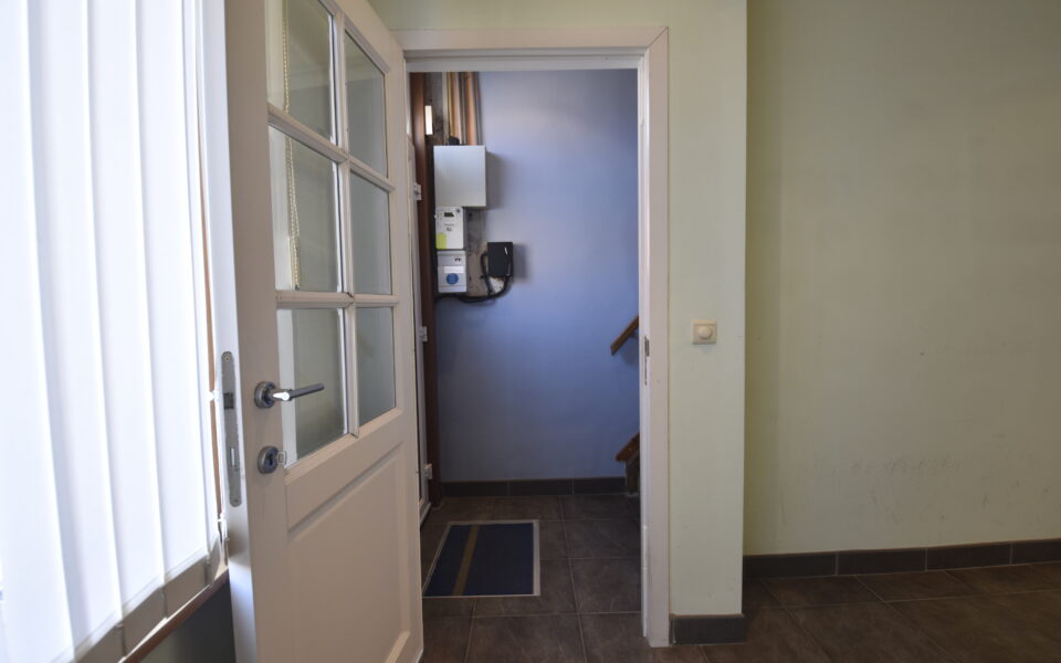 De inkomhal met trap brengt je naar de lichtrijke leefruimte, waar een open keuken naadloos overgaat in de zithoek met zicht op de tuin. Achteraan vind je een praktische berging én toegang tot de droge kelder — ideaal voor extra opslag. Verder is er een gastentoilet met handenwasser.