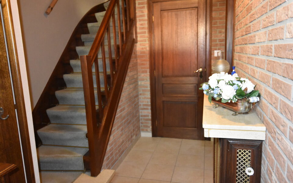 inkomhal (2.25 x 3,60) met aparte hangtoilet (2019) en eiken wenteltrap met leuning .
