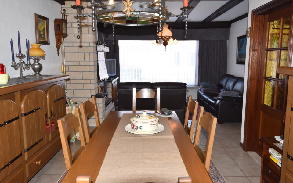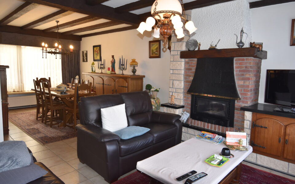 Ruime lichtrijke leefruimte (4,10 x 3,60) + (3,20 x 3,80) in L-vorm, plafond met molures, inbouwcassette en schouwhaard, keramische tegelvloer