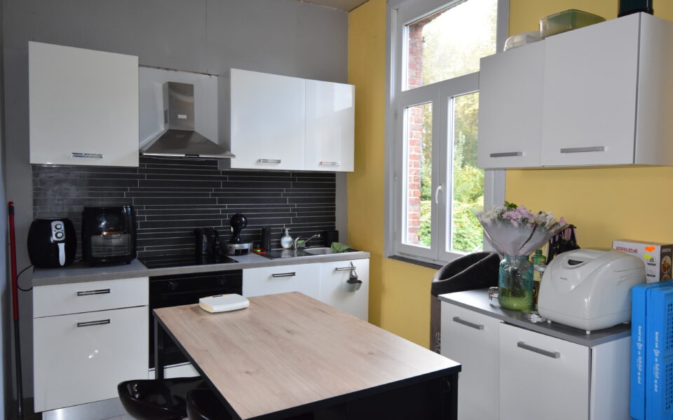 Vanuit de keuken heb je toegang tot het terras en de grote tuin met achterliggende uitgang naar de wandelpaden.