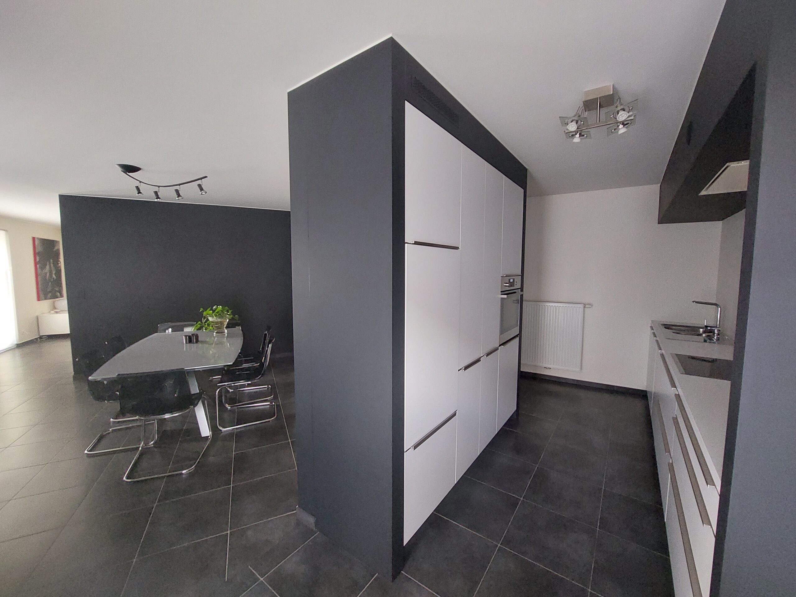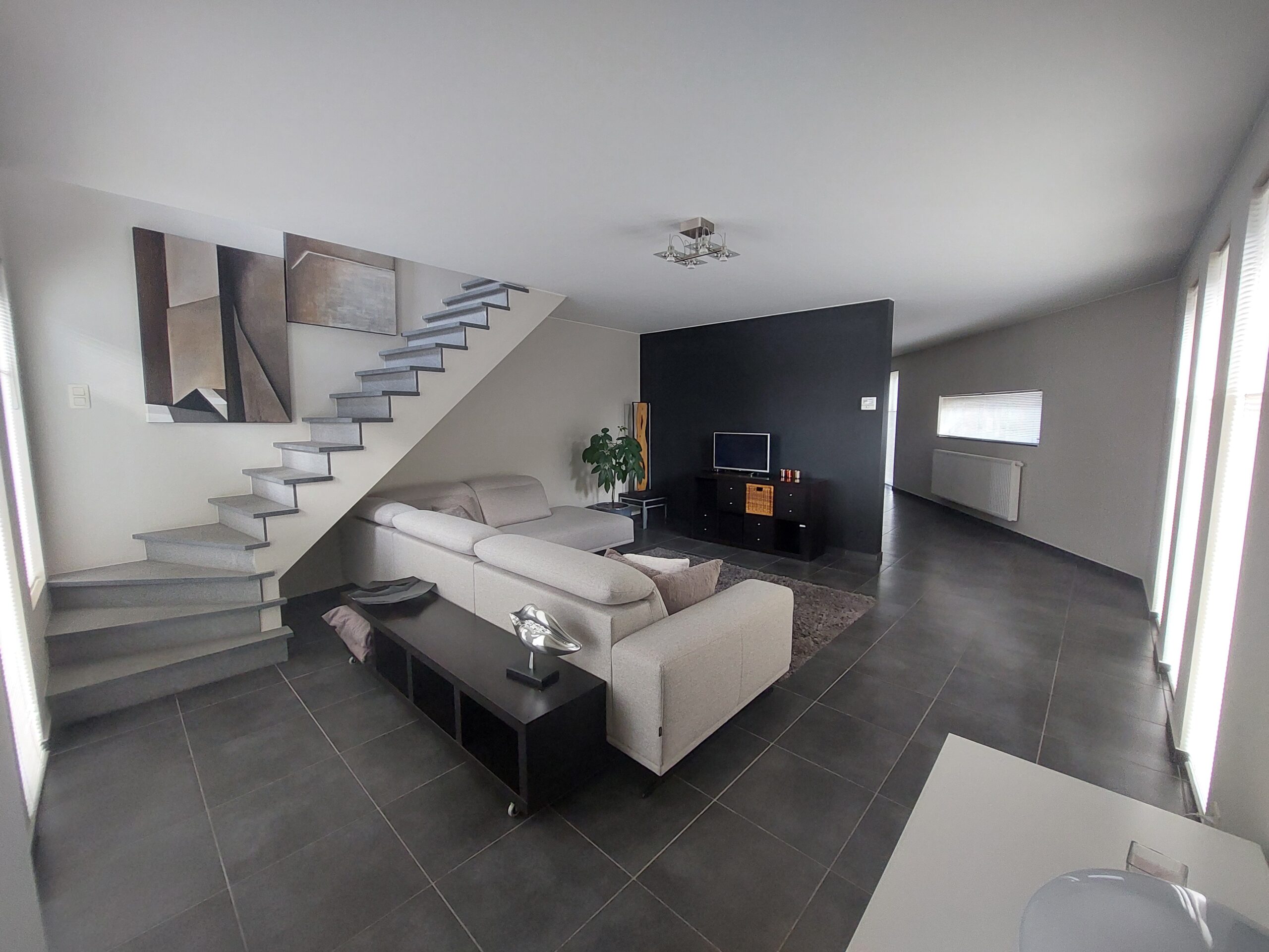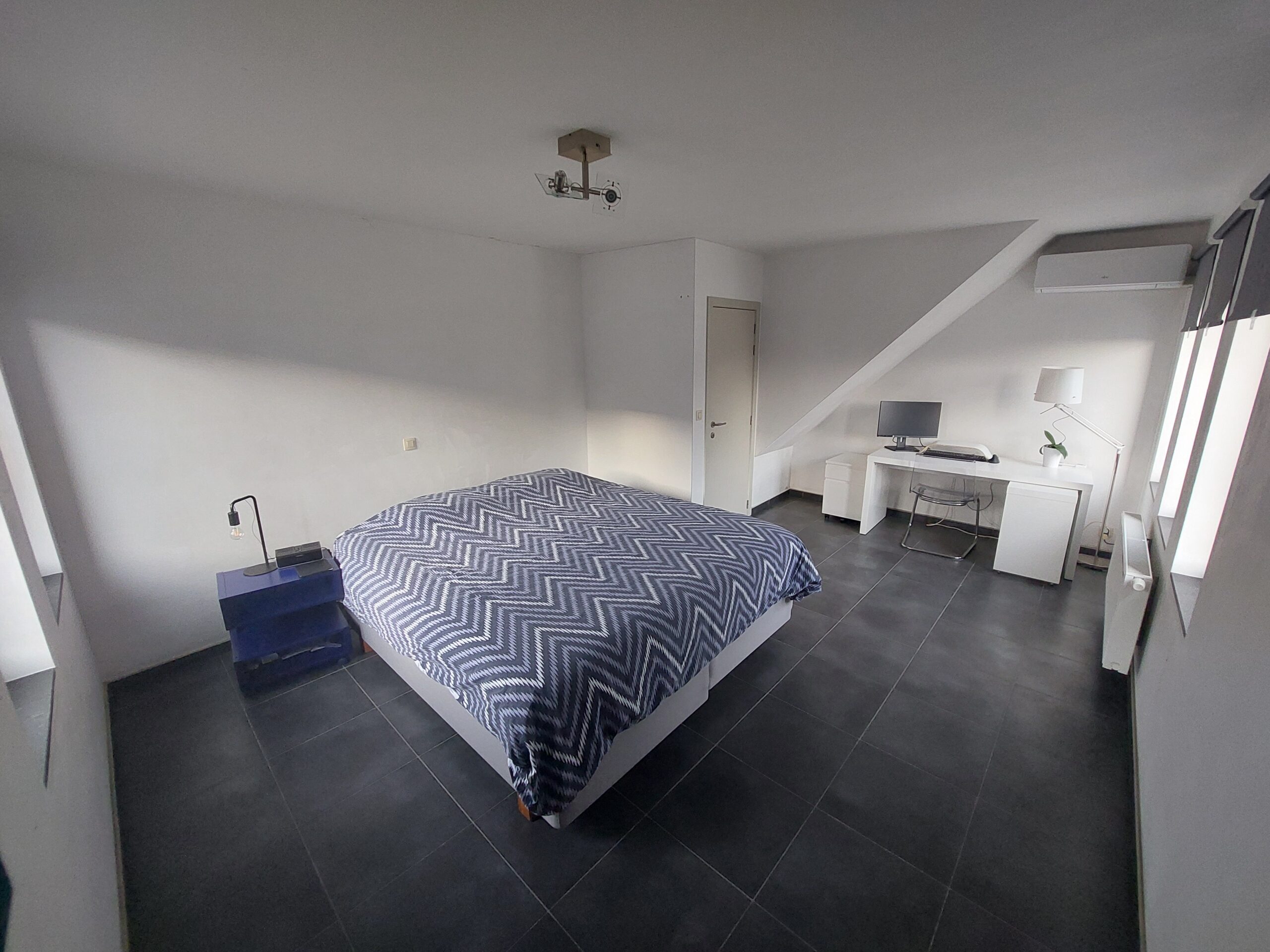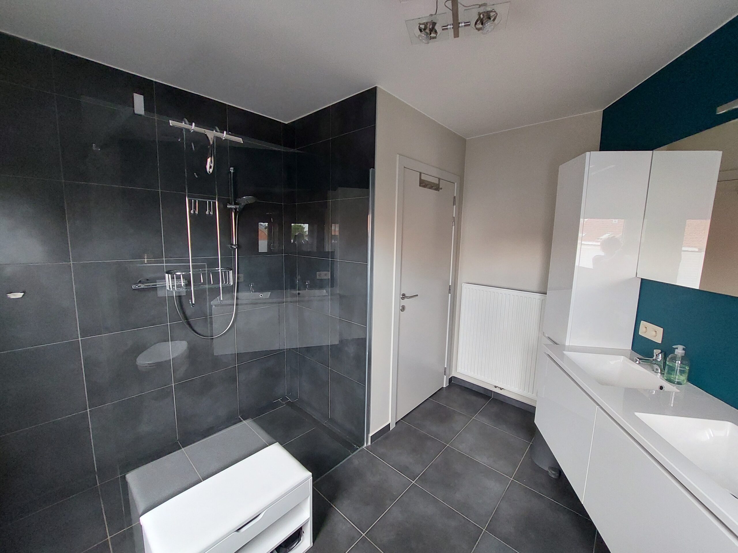 • 1e verdieping: nachthal, een zeer ruime slaapkamer, een tweede, kleinere slaapkamer die momenteel dienst doet als dressing en een moderne badkamer met inloopdouche, dubbele lavabo en toilet.