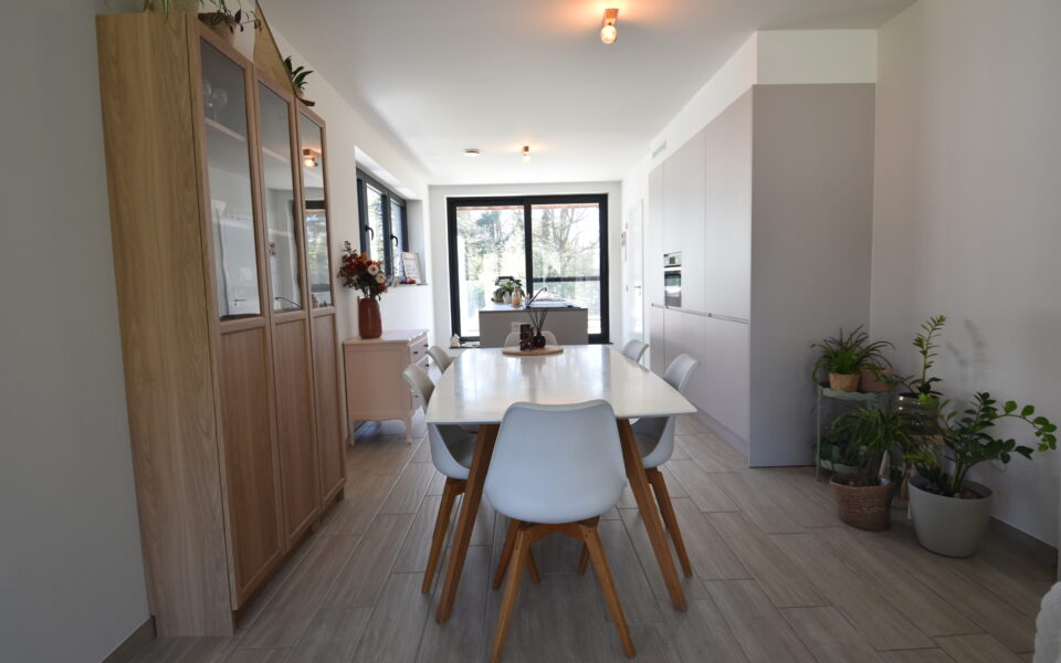 De inkomhal geeft toegang tot een gastentoilet met handenwasser. De zeer lichtrijke leefruimte sluit rechtstreeks aan op het terras en vormt samen met de open keuken een aangename woonomgeving. De keuken is volledig uitgerust met een inductiekookplaat, dampkap, combi-oven, vaatwasser, koelkast met diepvriesvak en een spoelbak.
