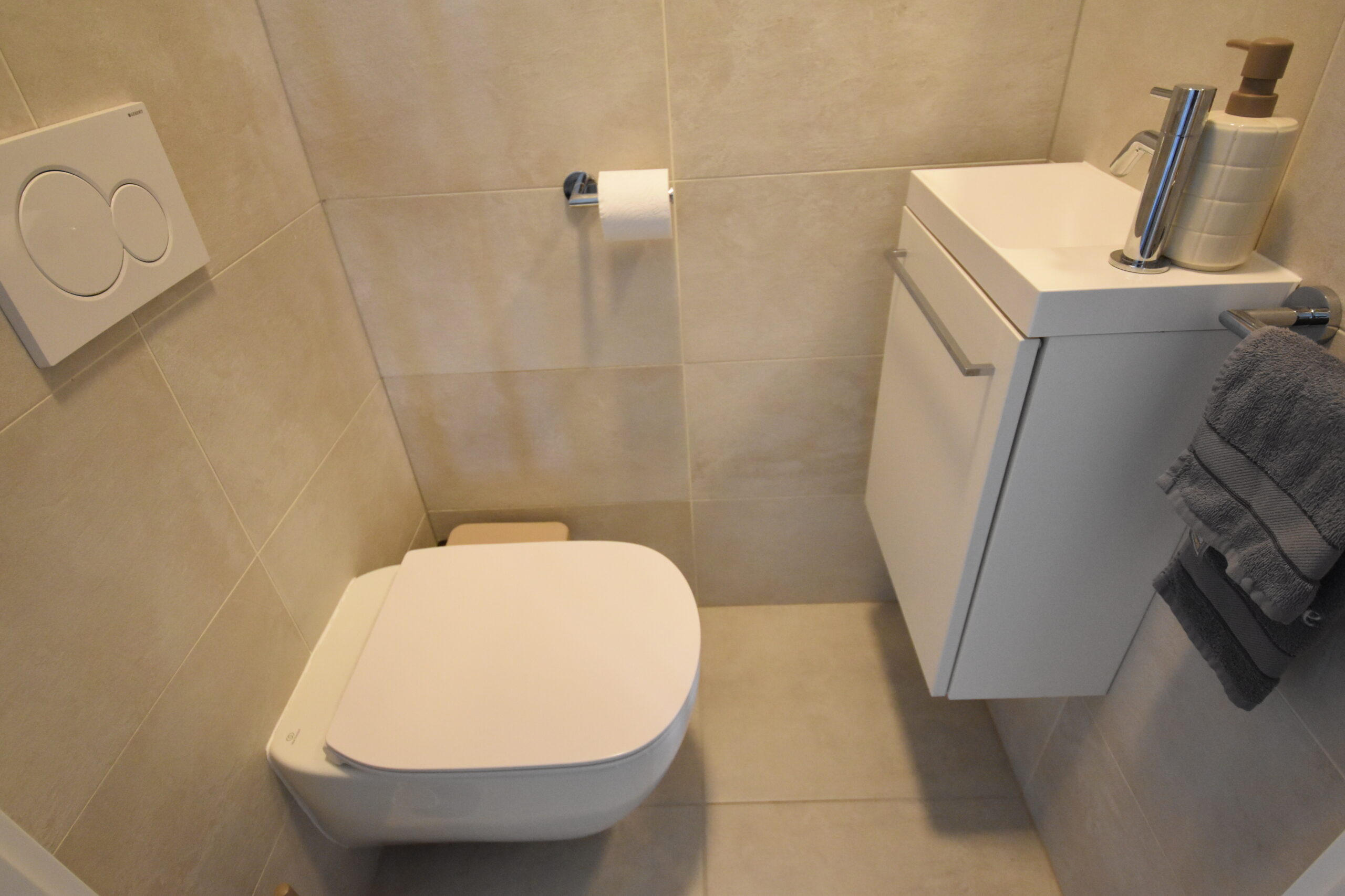 De inkomhal geeft toegang tot een gastentoilet met handenwasser. De zeer lichtrijke leefruimte sluit rechtstreeks aan op het terras en vormt samen met de open keuken een aangename woonomgeving. De keuken is volledig uitgerust met een inductiekookplaat, dampkap, combi-oven, vaatwasser, koelkast met diepvriesvak en een spoelbak.