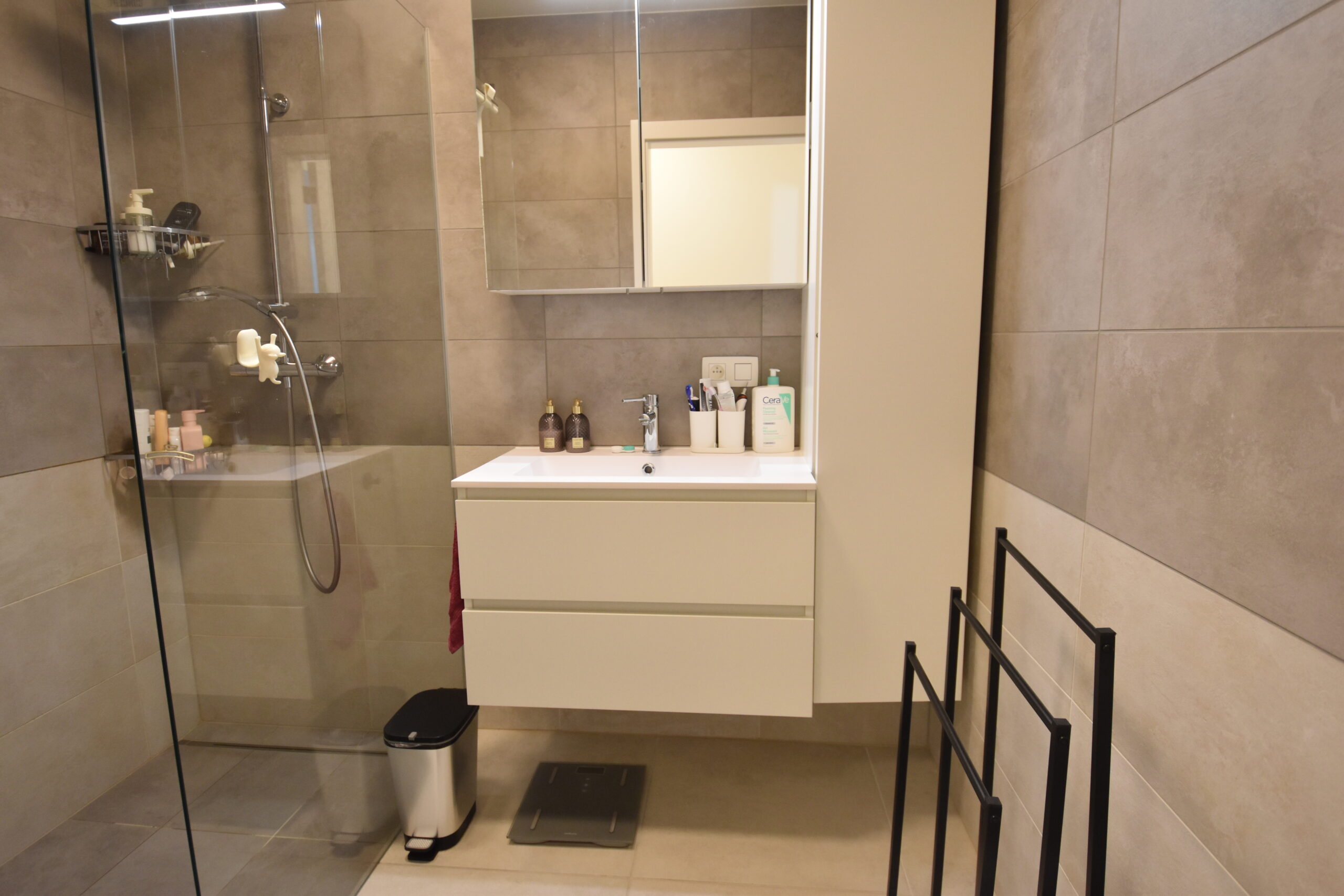 Het appartement beschikt over twee slaapkamers met oppervlaktes van respectievelijk 12,37 m² en 9,82 m². De moderne badkamer is ingericht met een inloopdouche en een lavabomeubel met verlichte spiegel. Daarnaast is er een praktische berging.
