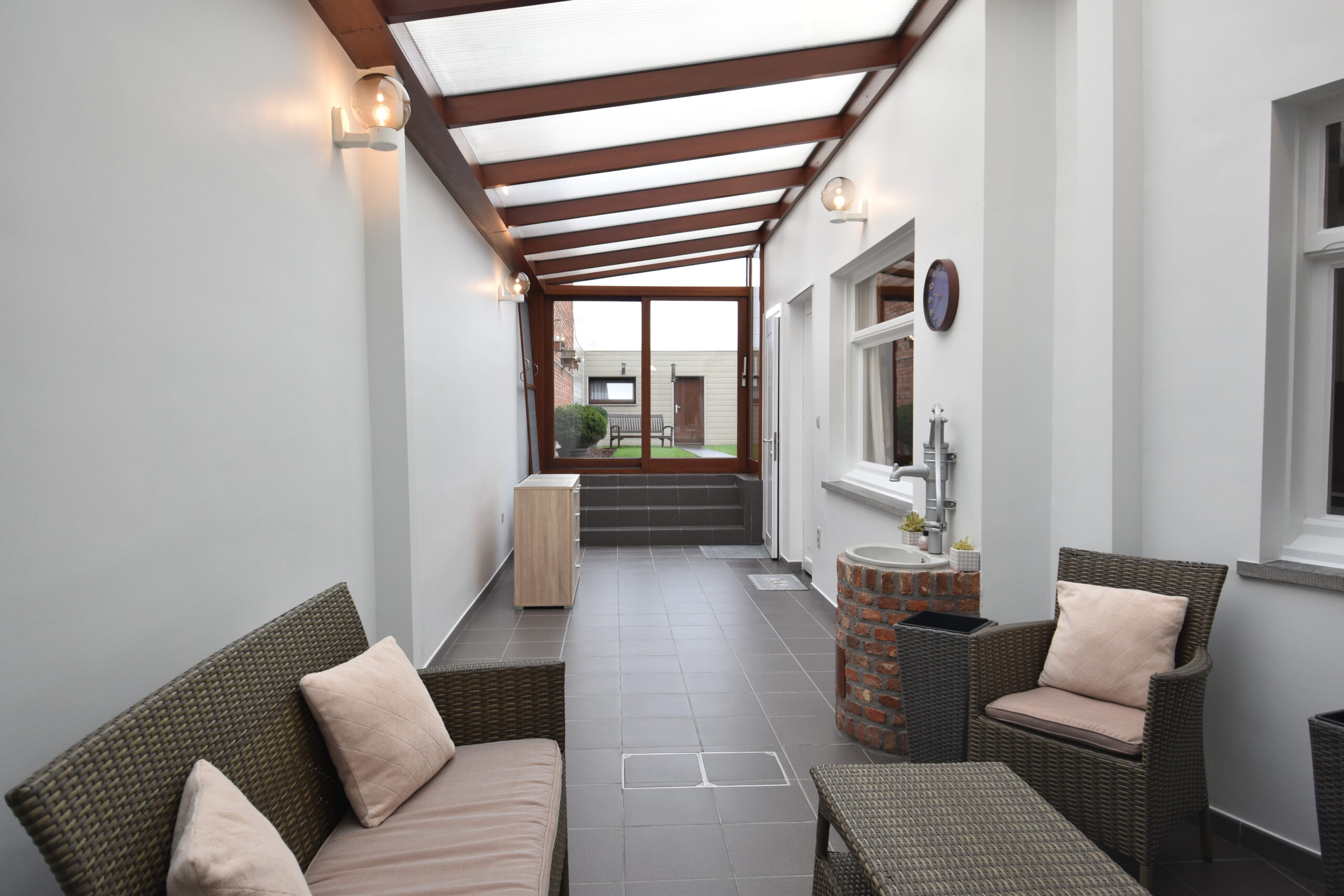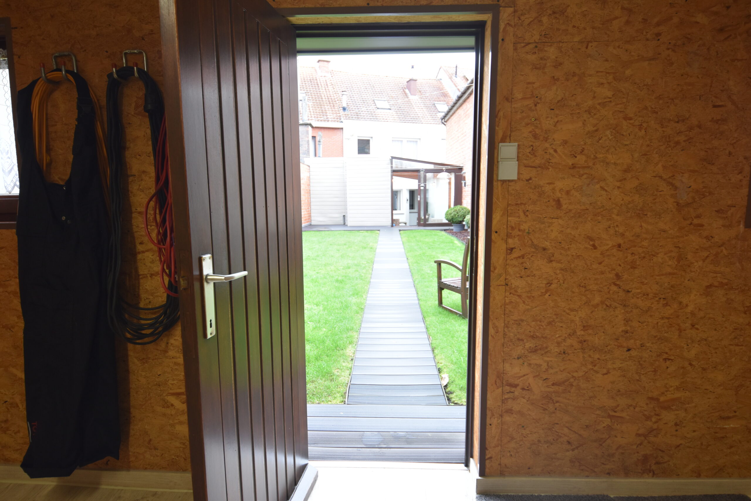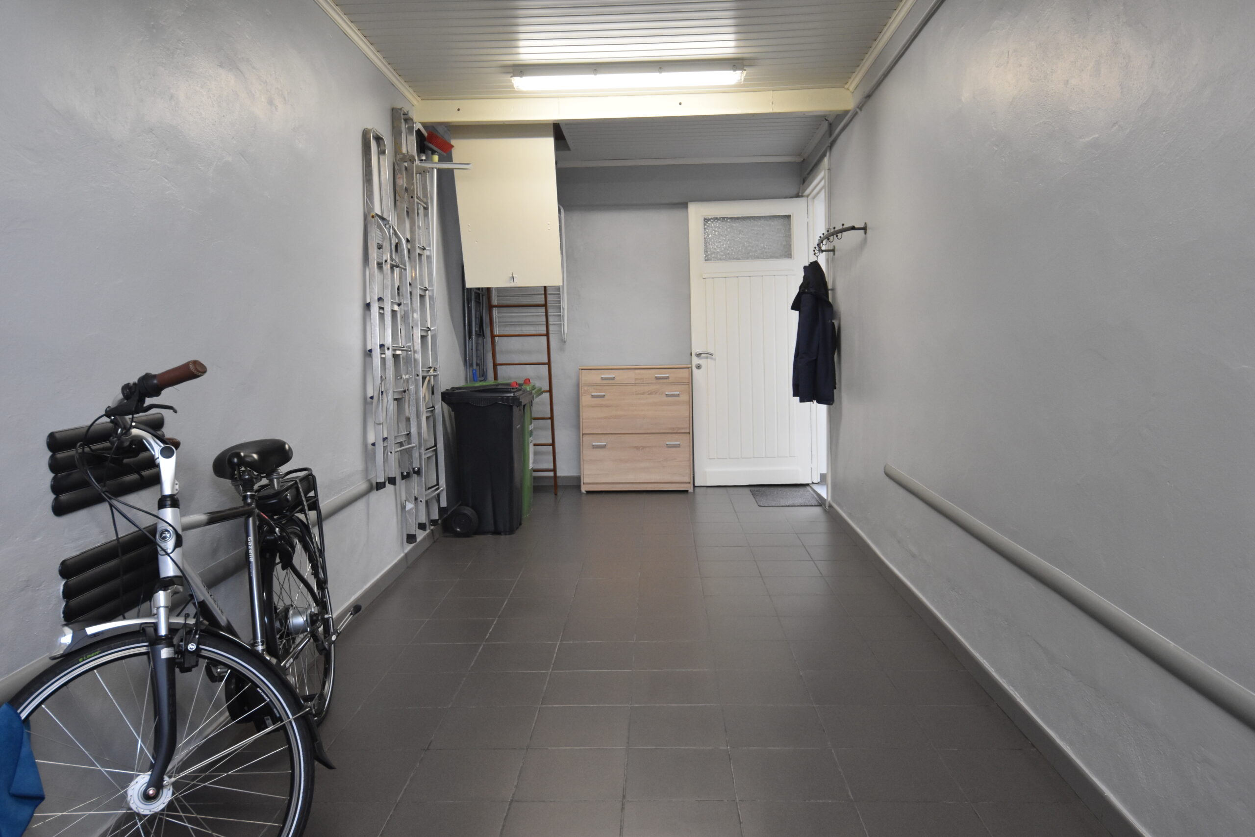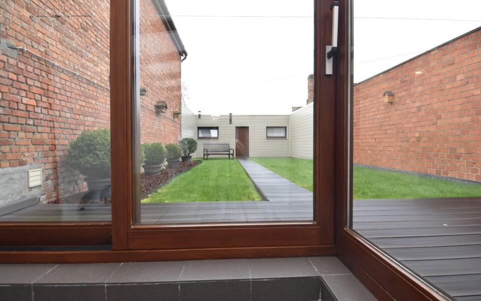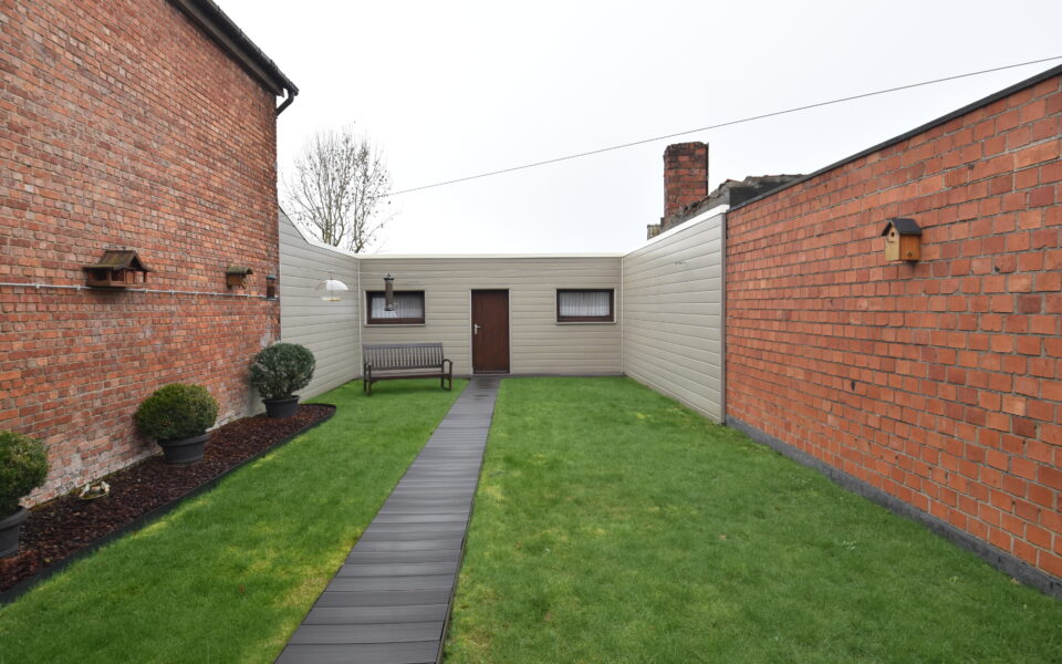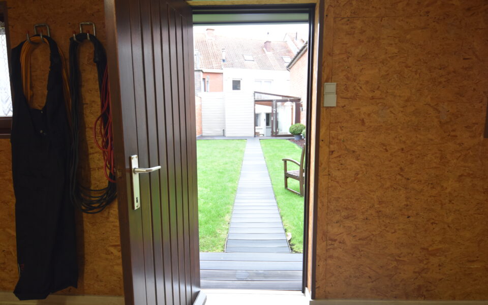 Aansluitend vind je een lichtrijke veranda met zicht op de tuin en toegang tot de volledig vernieuwde tuinberging. Extra praktisch zijn de garage en de bovenliggende hobbyruimte – ideaal voor wie graag klust, een atelier wil inrichten of gewoon extra bergruimte zoekt.