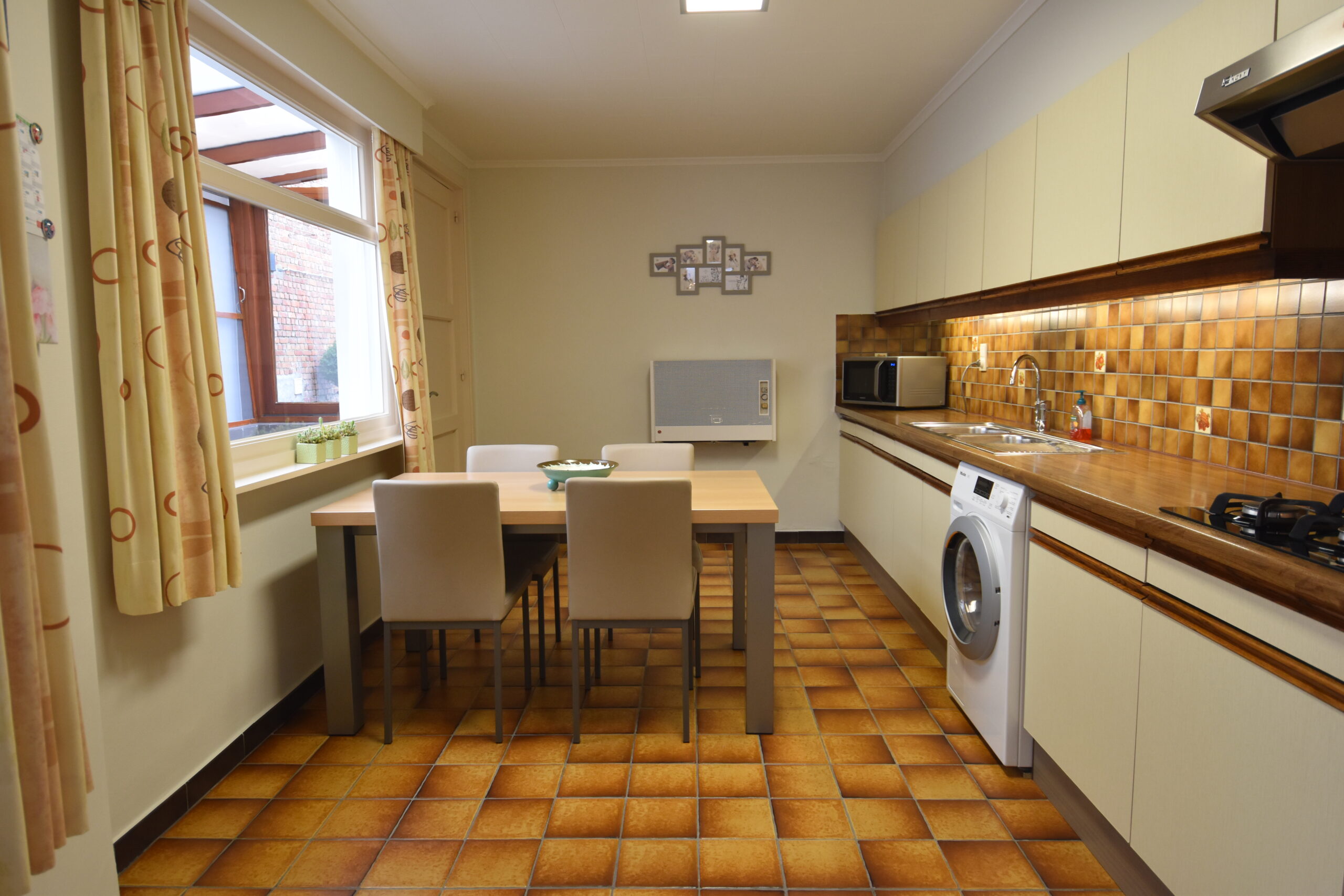 Je komt binnen in een warme, uitnodigende leefruimte die naadloos overgaat in de ingerichte keuken. Die is uitgerust met een dubbele spoelbak, gasfornuis, dampkap en koelkast met diepvriesvak – alles wat je nodig hebt om meteen aan de slag te gaan.