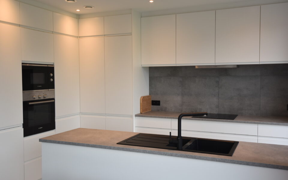 Aansluitend tref je de moderne open keuken met veel bergruimte: dubbele spoelbak, Inductiekookplaat, vaatwasmachine, ijskast, aparte diepvries, microgolfoven, elektrische oven, keukenkraan met uittrekbare kop.