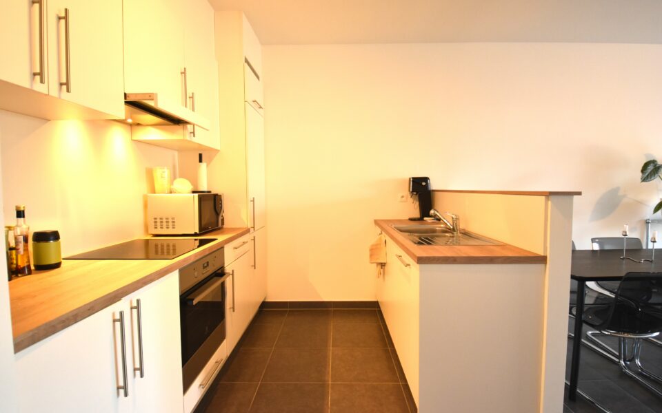 De keuken is volledig uitgerust en praktisch ingericht met een spoelbak, vitrokeramische kookplaat met dampkap, vaatwasmachine, koelkast, diepvries en een elektrische oven.