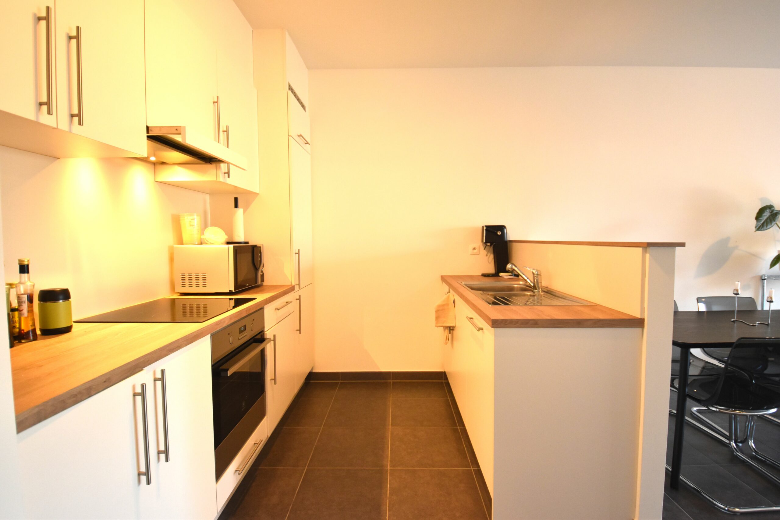 De keuken is volledig uitgerust en praktisch ingericht met een spoelbak, vitrokeramische kookplaat met dampkap, vaatwasmachine, koelkast, diepvries en een elektrische oven.