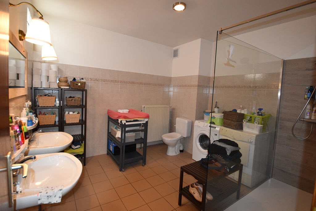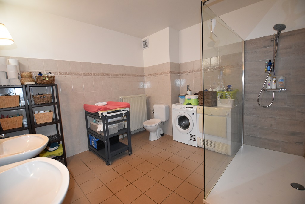 De zeer ruime badkamer beschikt over een inloopdouche, toilet en een dubbele lavabo. Daarnaast is er voldoende ruimte voorzien voor het plaatsen van een wasmachine en droogkast.