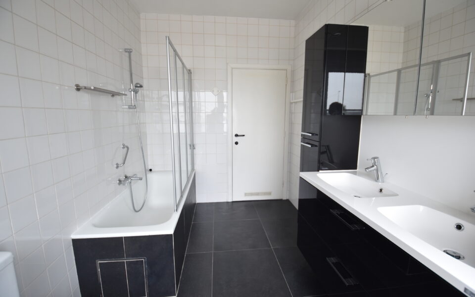 . Volledig betegelde badkamer (6.1 m²) met ligbad (douchemogelijkheid), wasmeubel met dubbele lavabo, toilet.