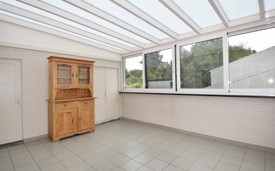 . Zeer lichtrijke leefruimte (36.95 m²), wand met inbouwcassette en ingemaakte kasten, vloer natuursteen.