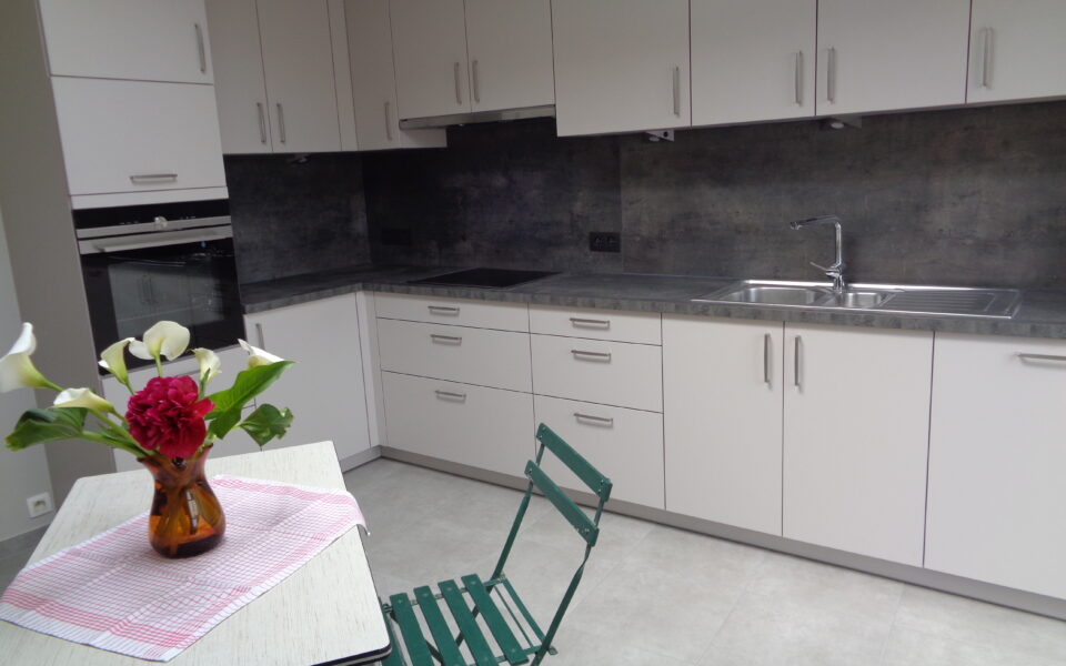 . Ingerichte keuken : keramische kookplaat, dampkap, vaatwasmachine, elektrische oven, dubbele spoelbak