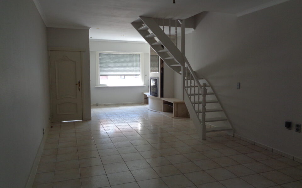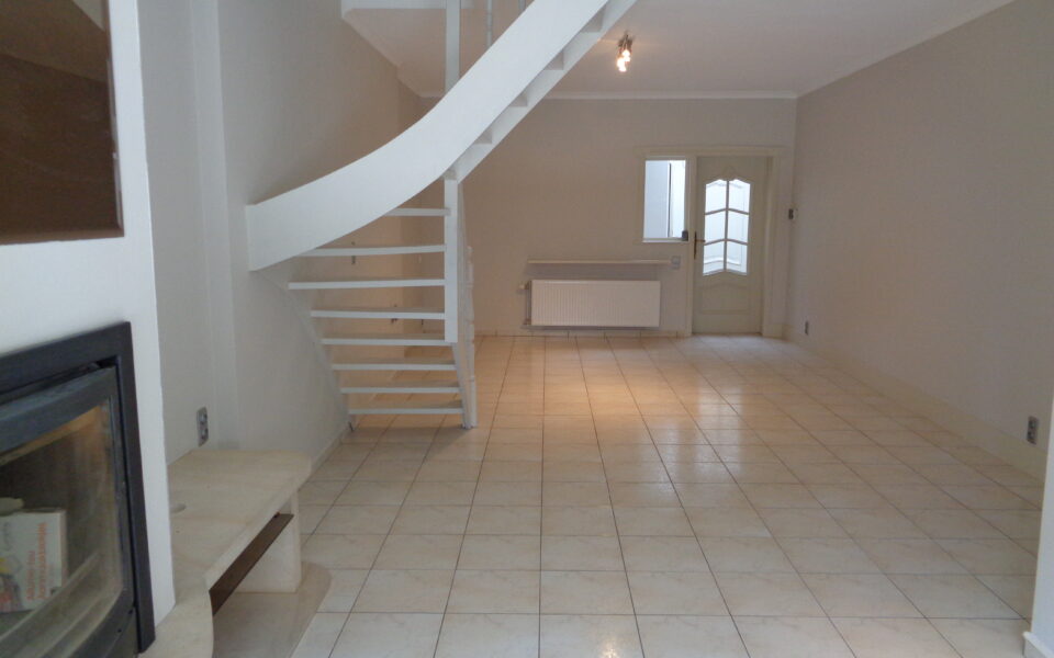 . Zeer ruime leefruimte, keramische vloer met sierschouw en houten trap naar boven