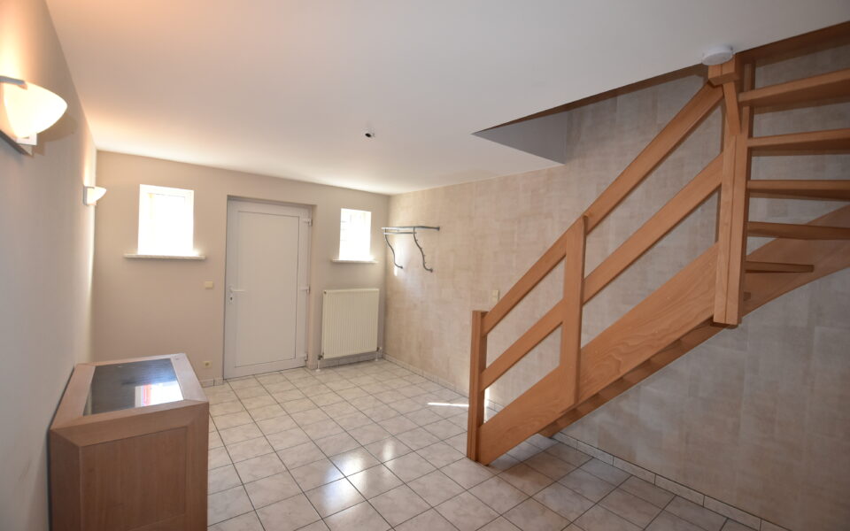 Op het gelijkvloers kom je via de riante inkomhal met houten trap de woning binnen,
