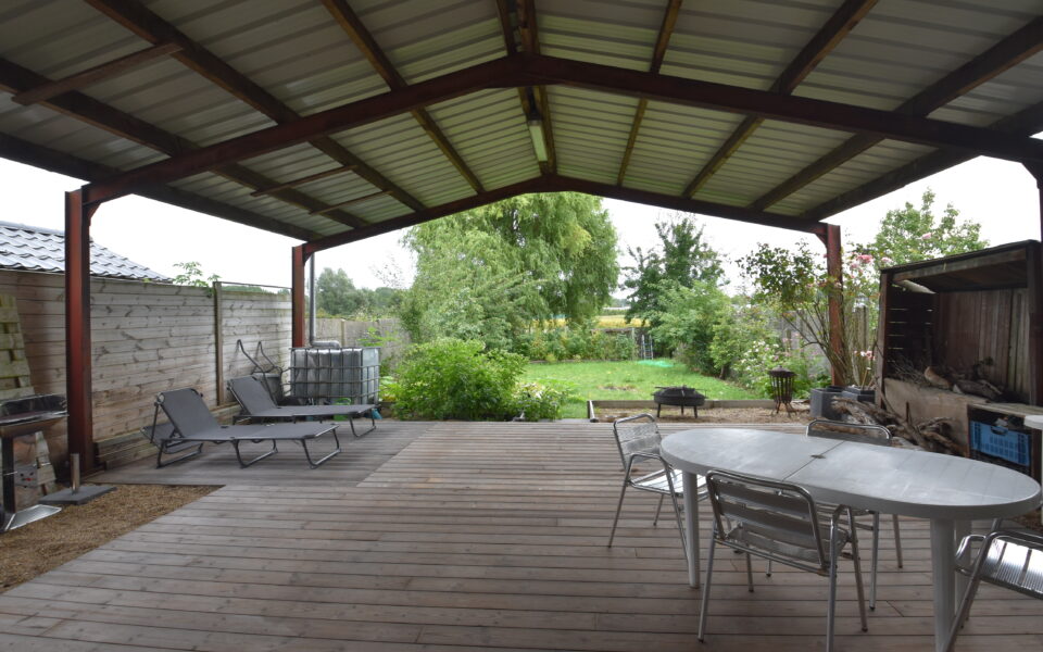 Via de zaal kom je op het ruime overdekte terras en de tuin met gazon, moestuin en fruitbomen.